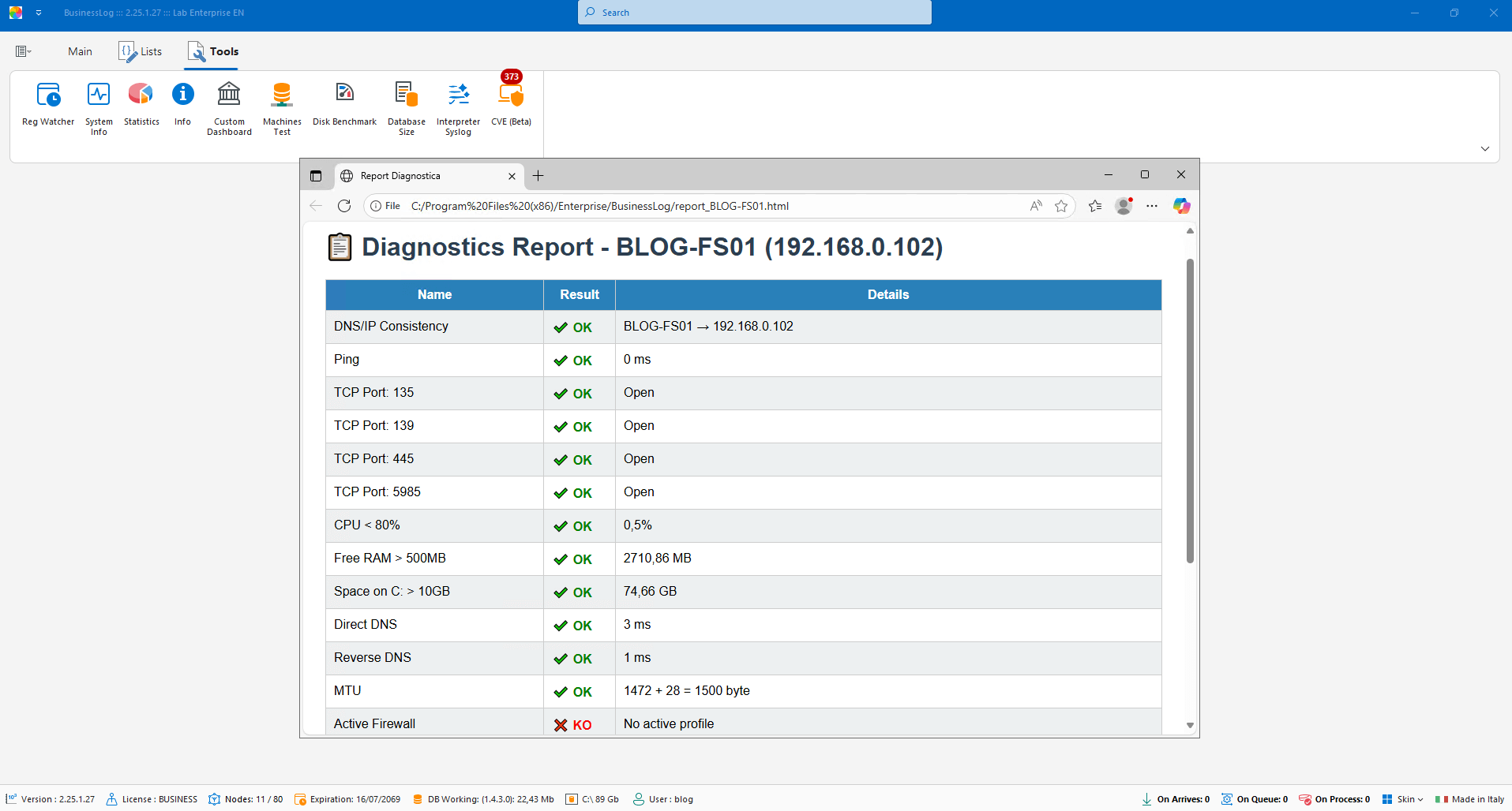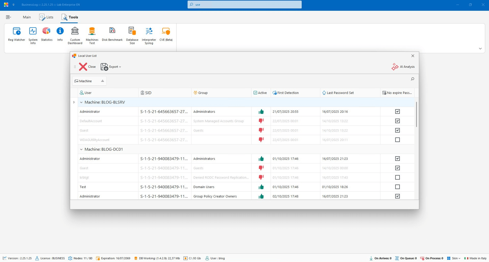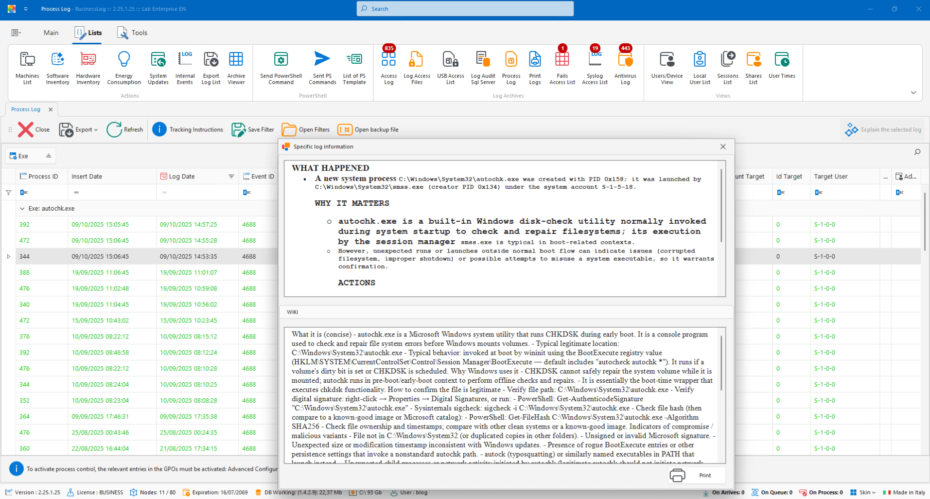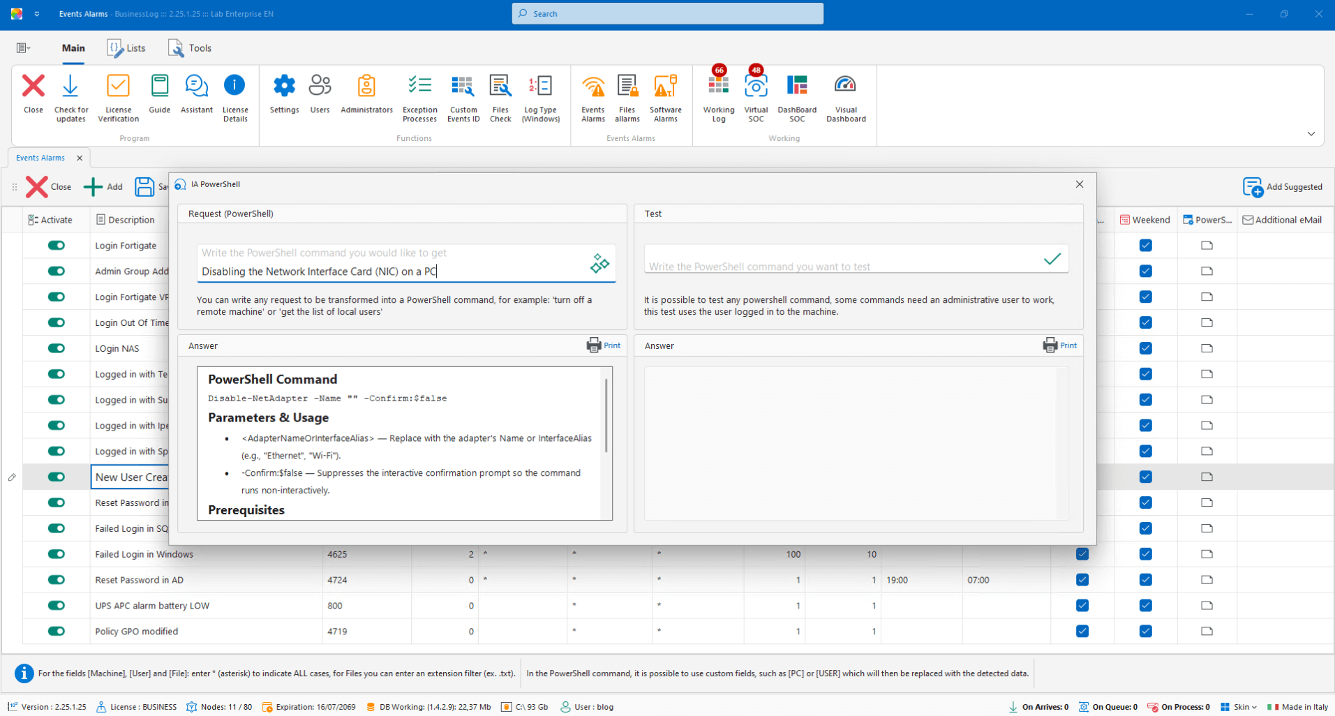 Reactive automation: when a selected event occurs, Business LOG uses an AI engine to generate and execute PowerShell commands in real time, following the rules set by the user.