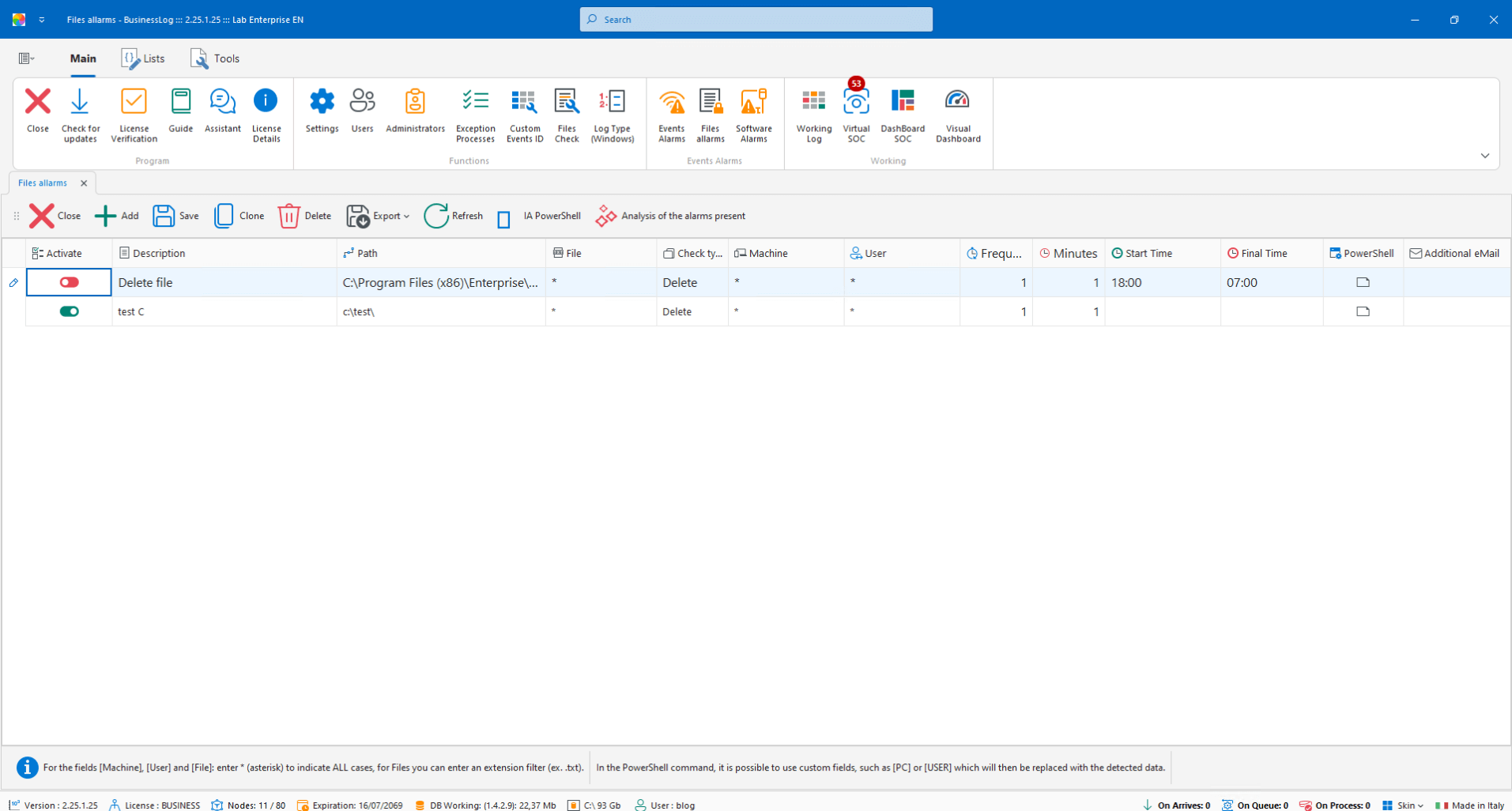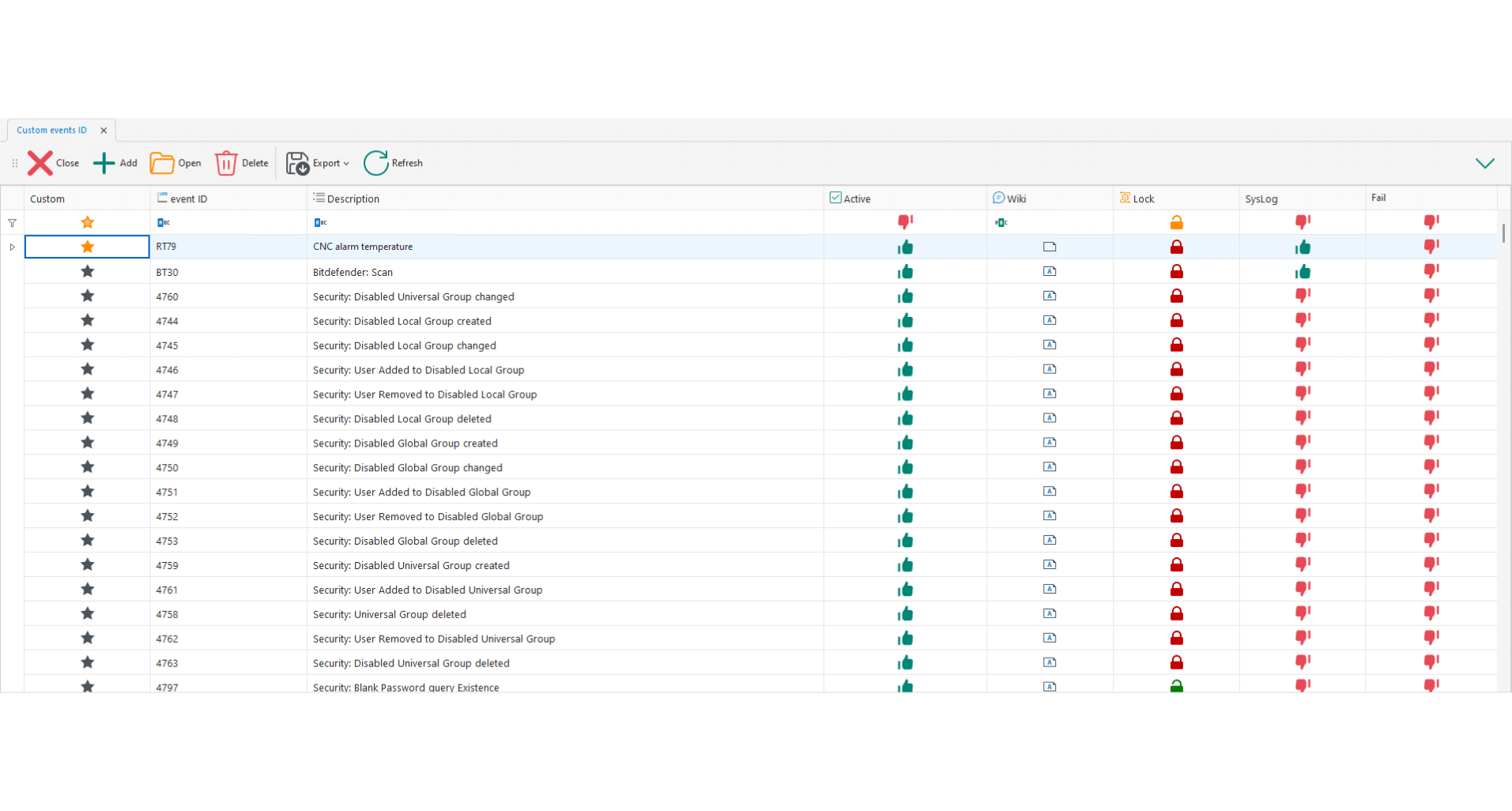 Select security events already present in the system and configure alarms via email, Telegram or PowerShell commands generated by AI. Filter by device, users and frequency.