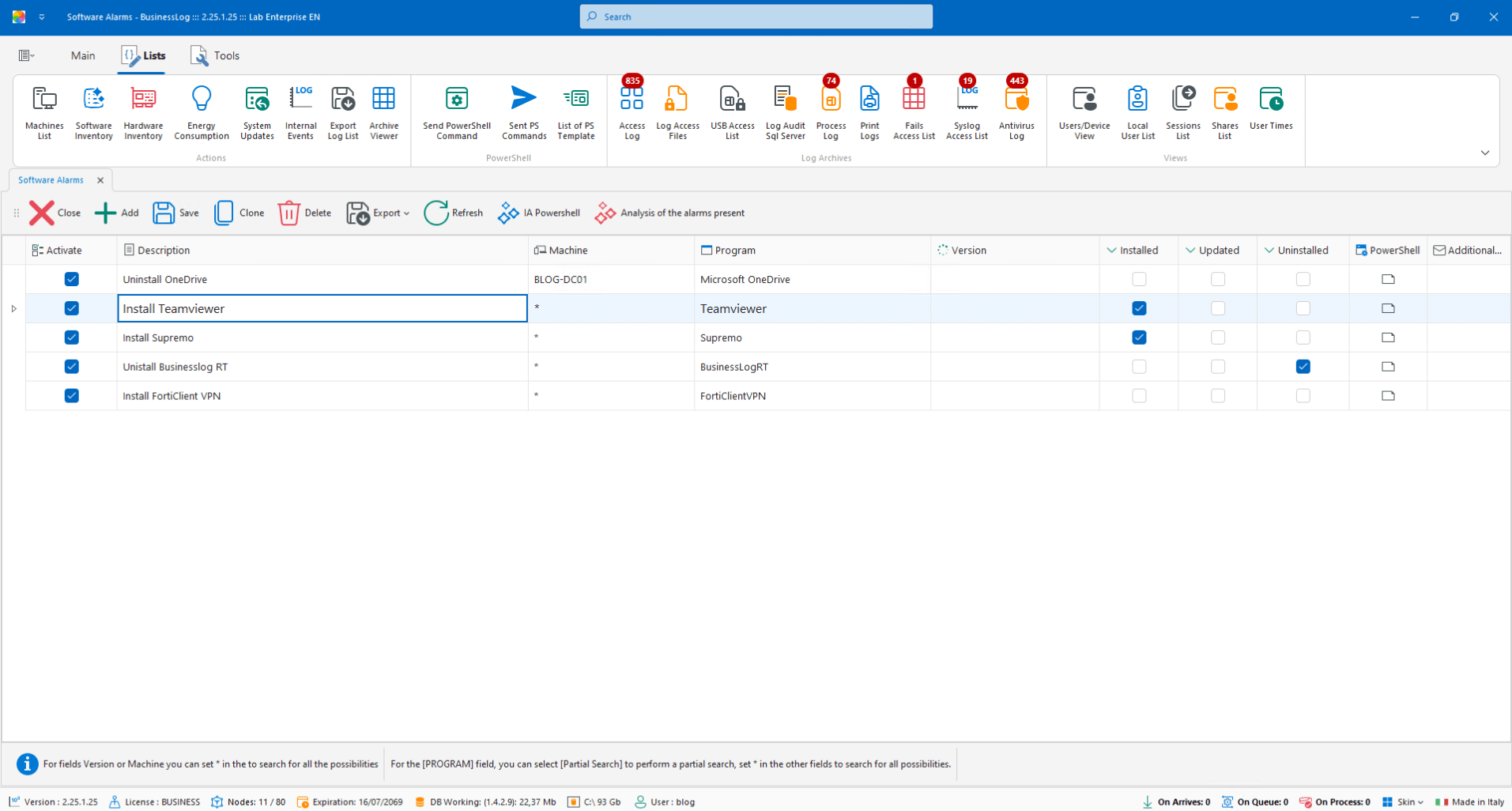 Automatic software inventory and alerts when a program is installed, removed, or updated, with linked commands and notifications.