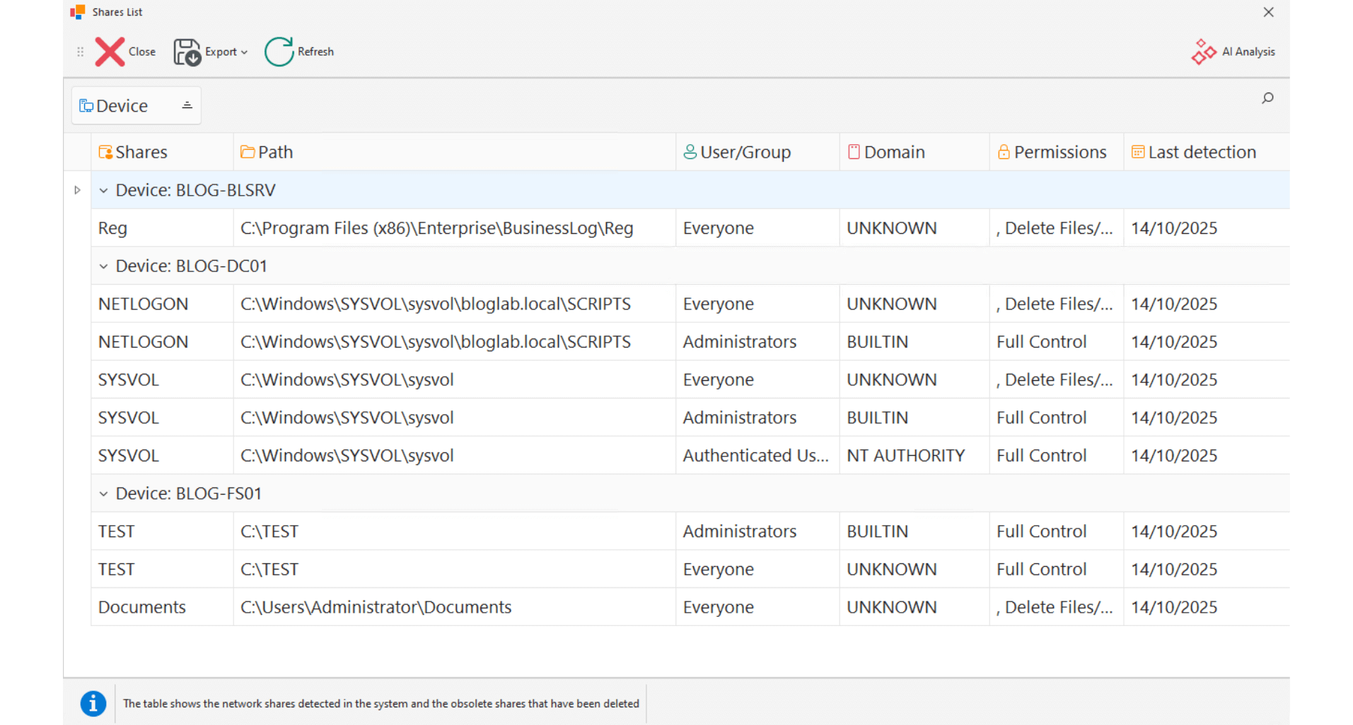 Global view of shared folders by machine, with permission level (read, write, full control).