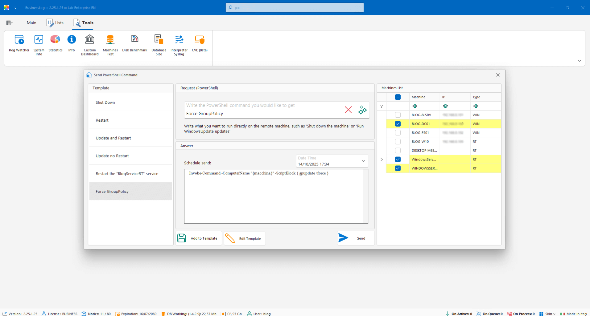 Programmable PowerShell sets: use ready-made commands or create new ones with the help of AI. Schedule and assign to one or more hosts.