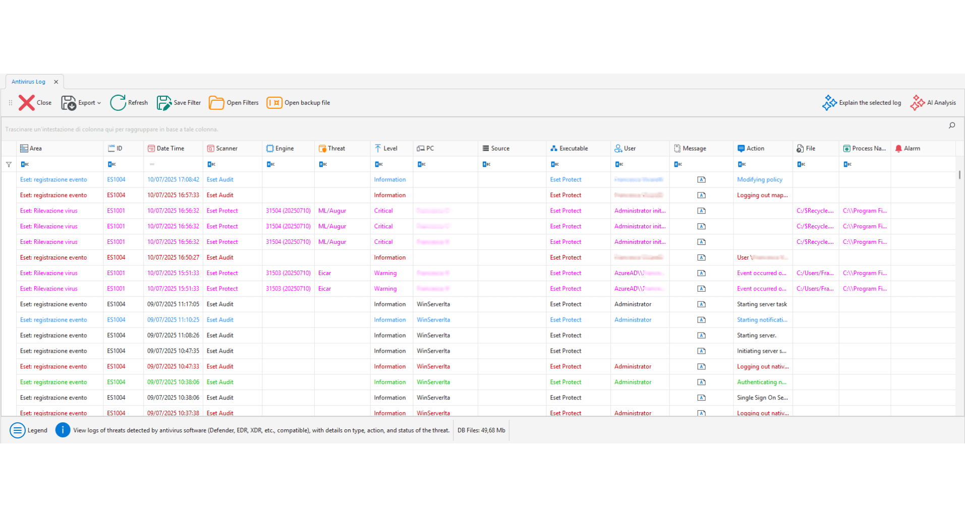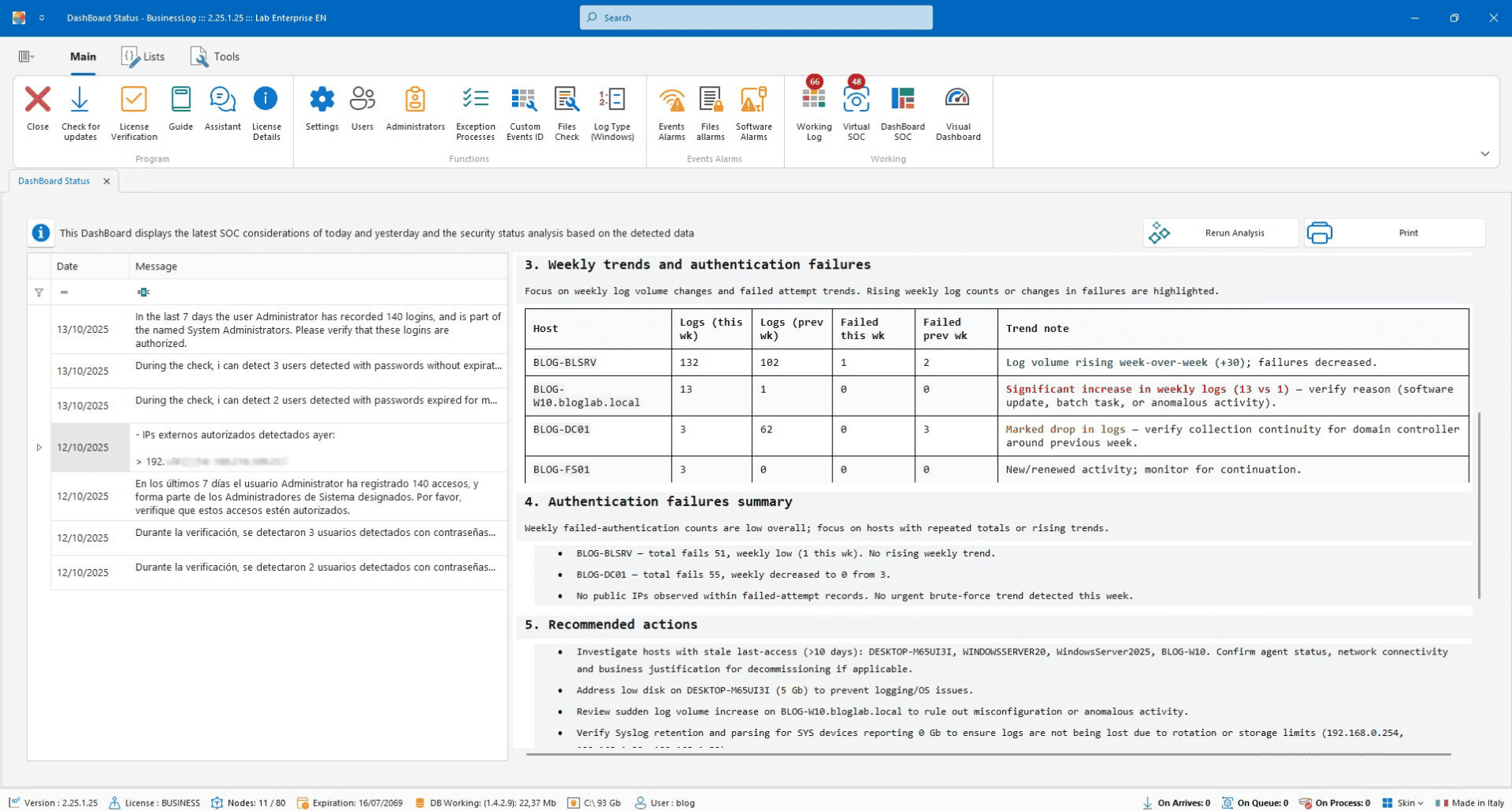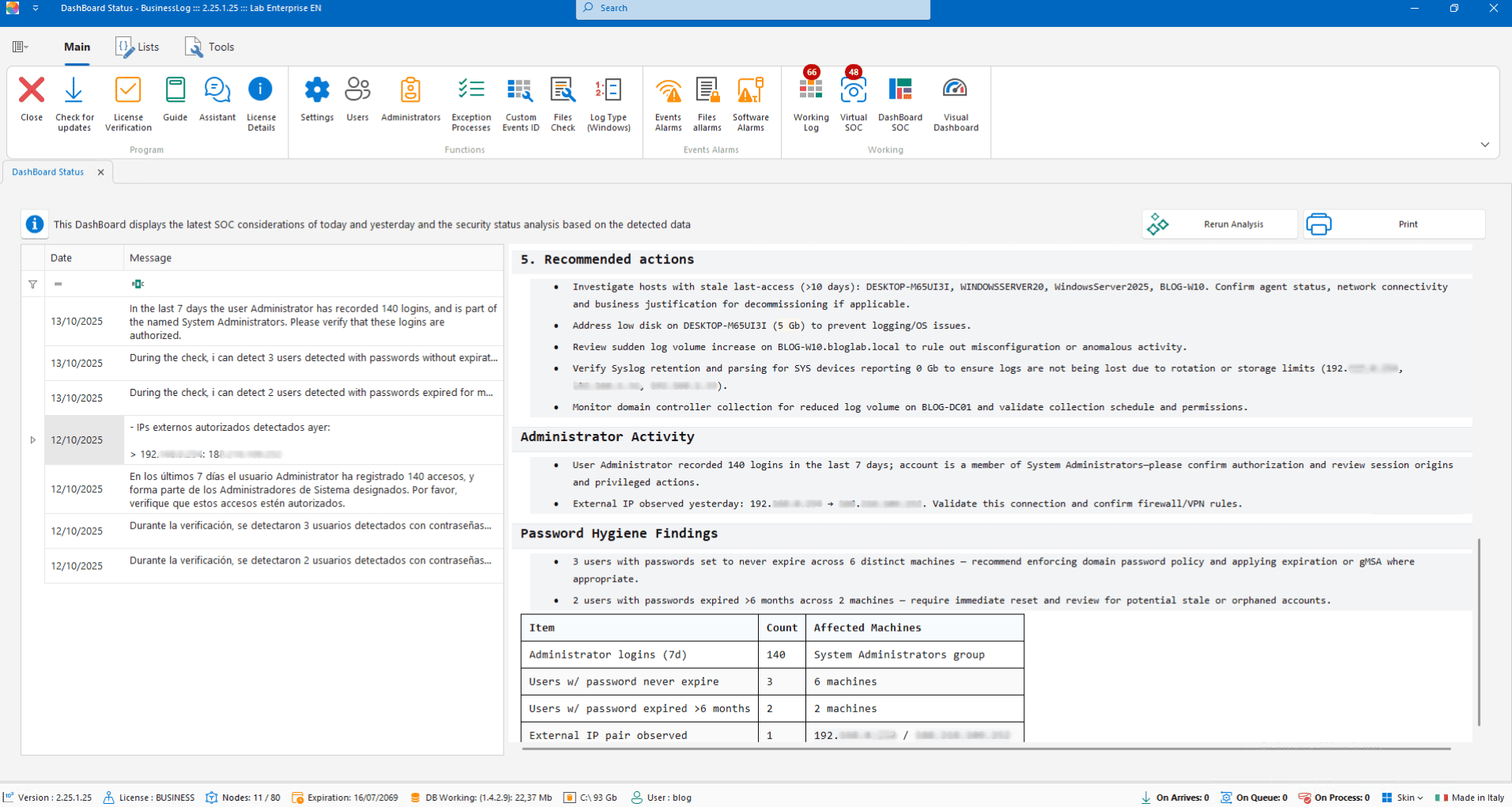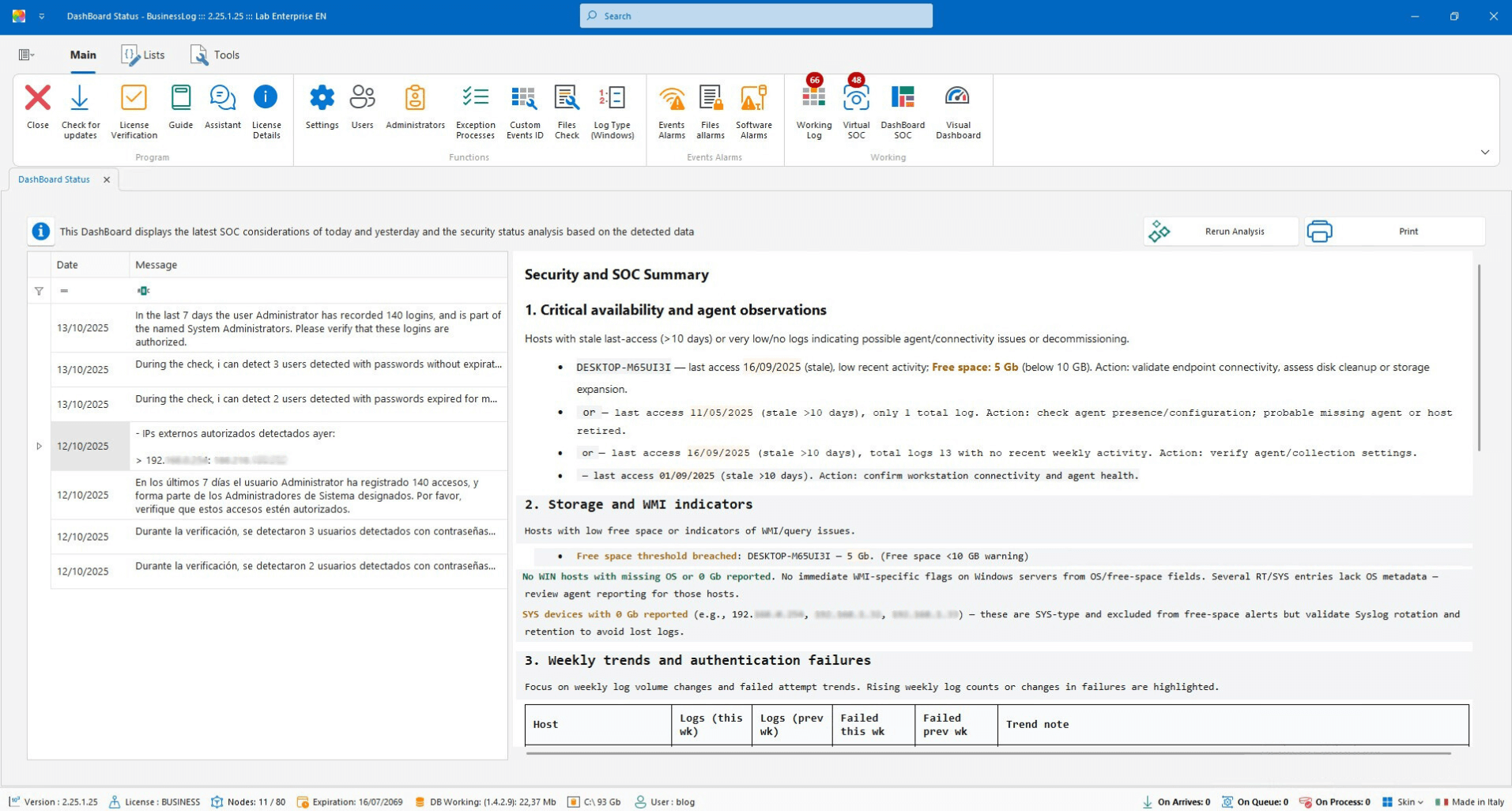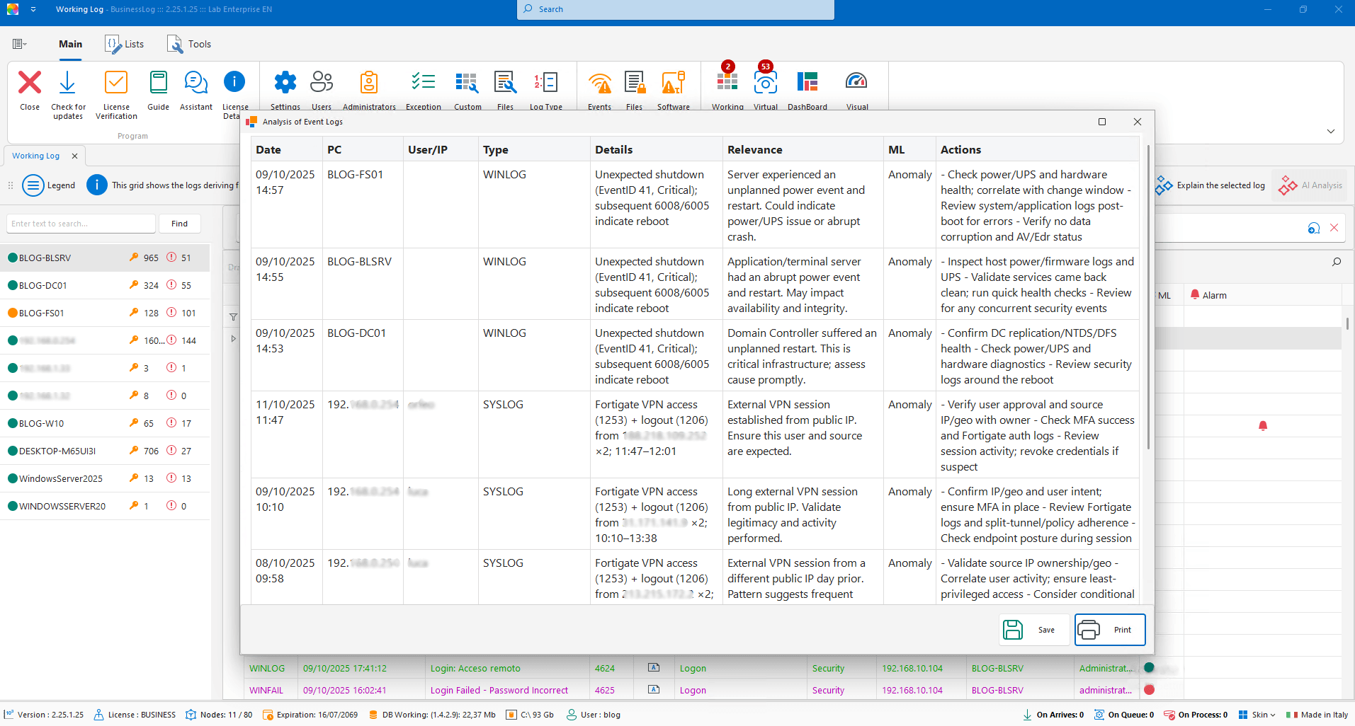 Through the AI Plugin it is possible to submit a set of logs for automated analysis, exploiting the potential of the AI 2.0 engine. The system returns a real-time report on the organizational impact and the main safety findings, allowing a timely and effective evaluation of the detected criticalities.