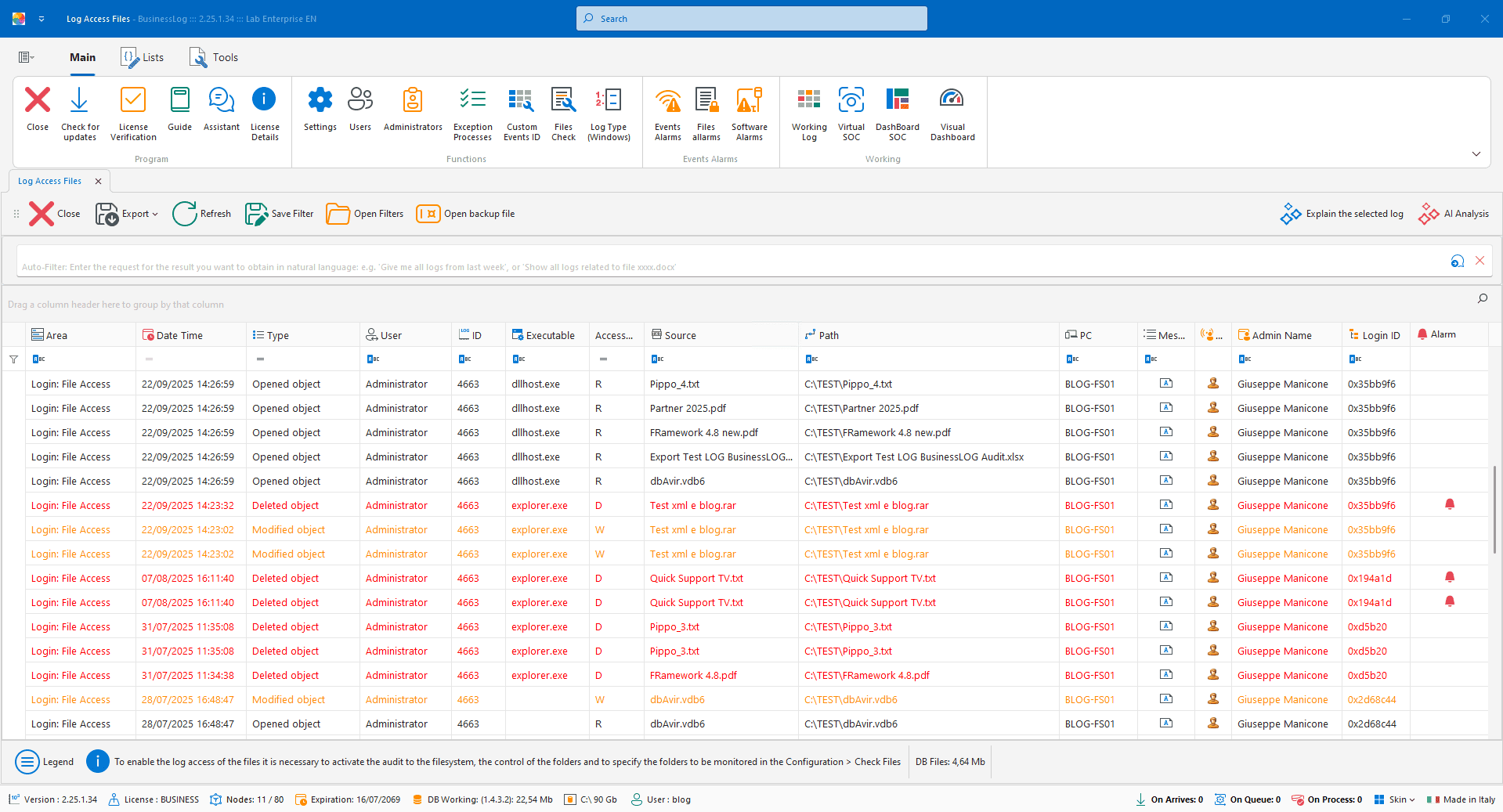 Monitor critical paths and activity on files/folders: opens, edits, deletions, and denied access, with centralized logs and alerts by user, device, and frequency.