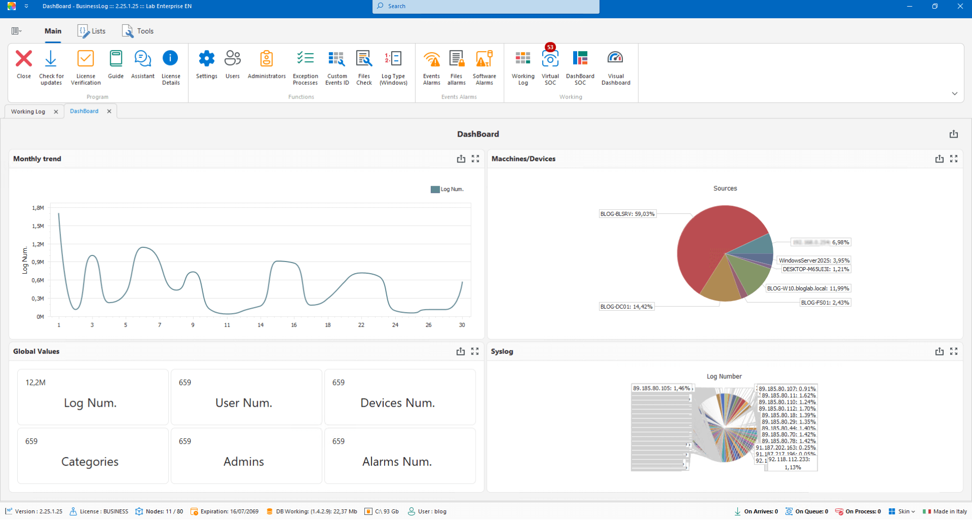 Through the SOC Stream Plugin, information collected by the SOC (installed on-premise) can be accessed on a dedicated Web site, thus ensuring a complete, always available, real-time view of security and compliance activities.