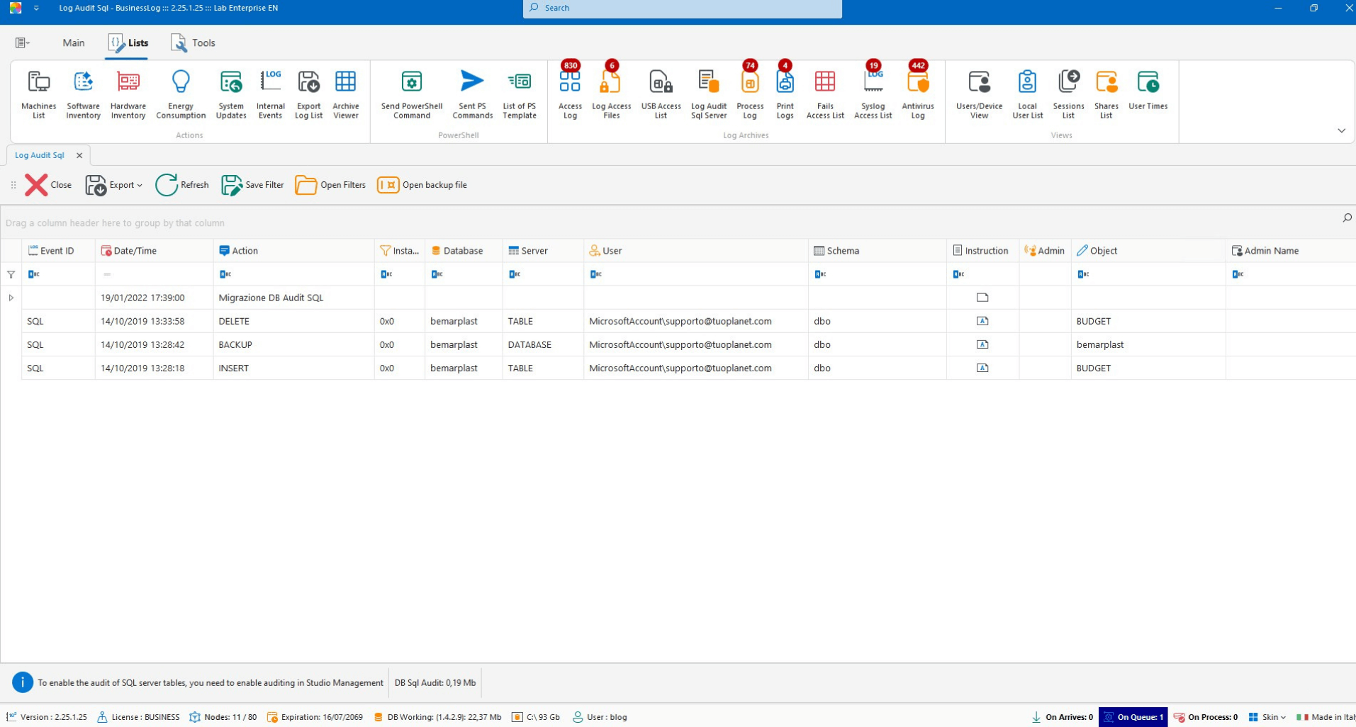 The SQL Plugin allows to acquire logs from the advanced audit of SQL server and get information about queries in use in database tables.