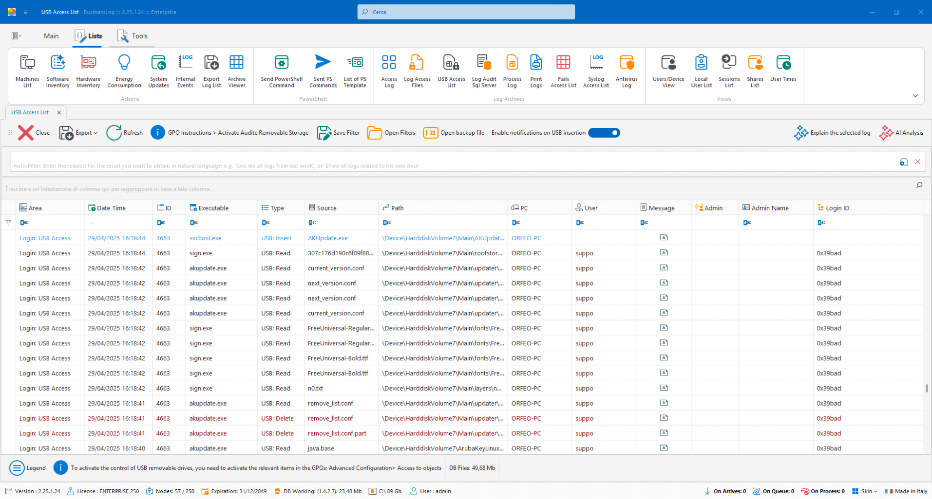 Lists all accesses to removable devices (USB, external HDDs, SD, etc.) and allows alerts on insertion.